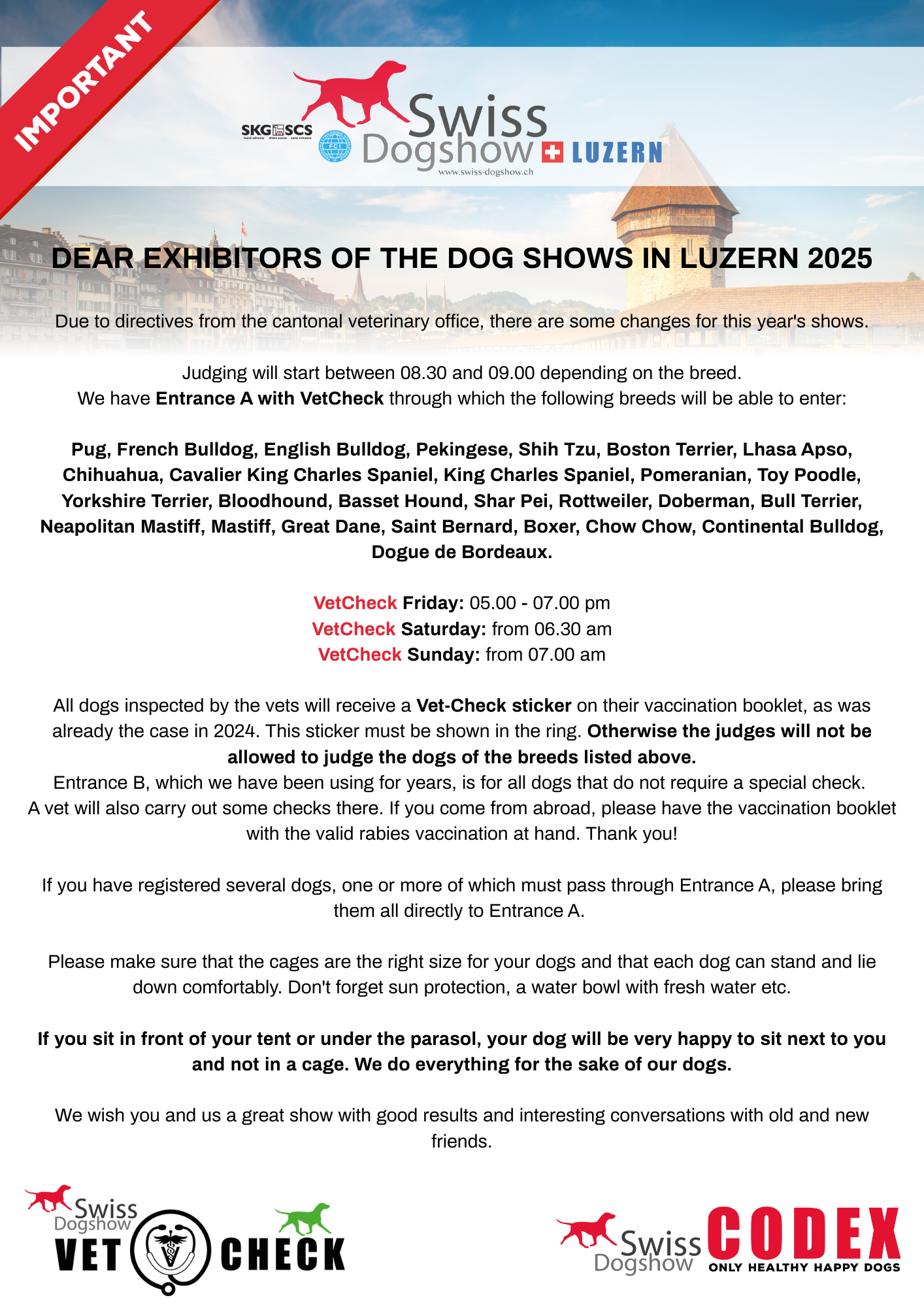 is awarded to dogs that have already been certified as “Swiss Show Champion” and/or “Swiss Beauty Champion” and have been awarded three CACs under three different judges at international Swiss CACIB shows from June 1st 2024 in the Champion class, including at least one CAC/CACIB and BOB or BOS. A reserve CAC can’t be used.